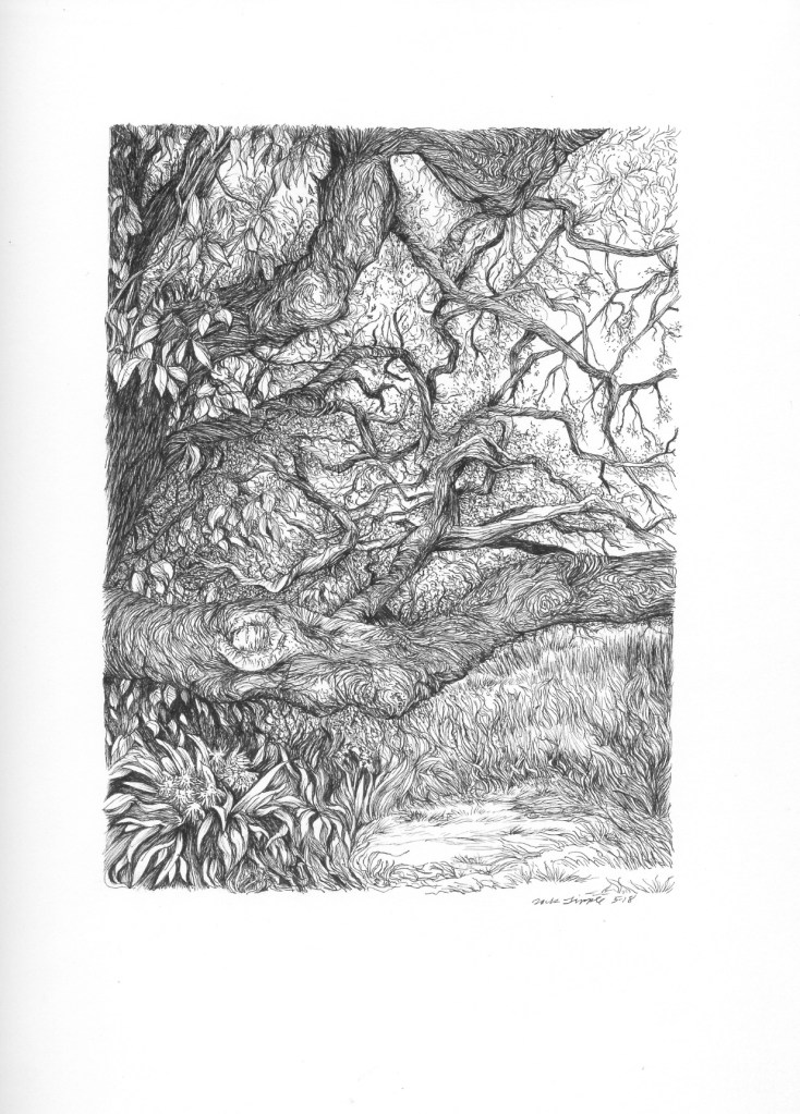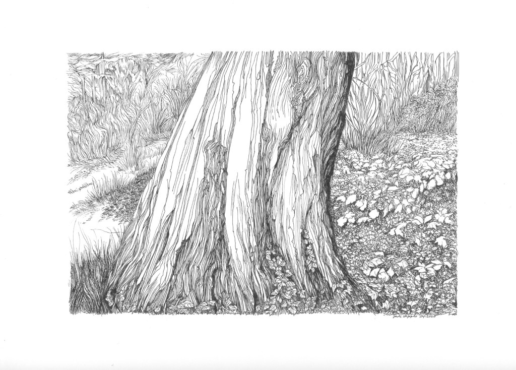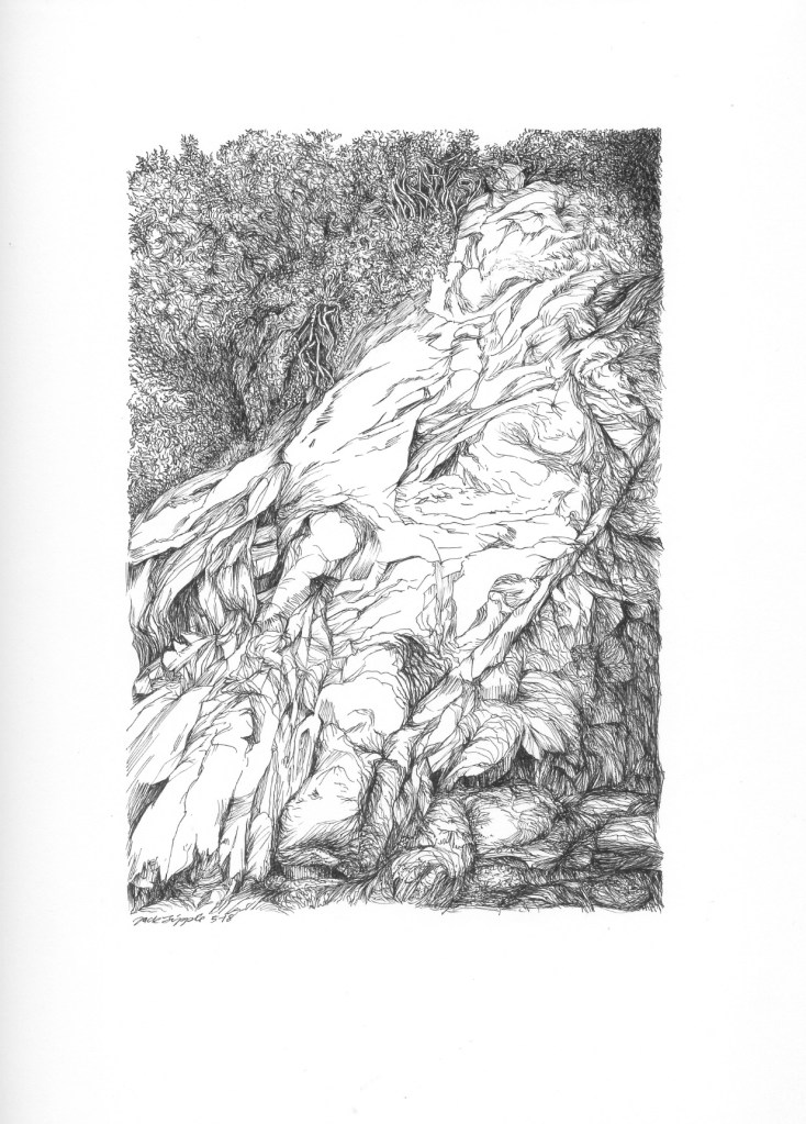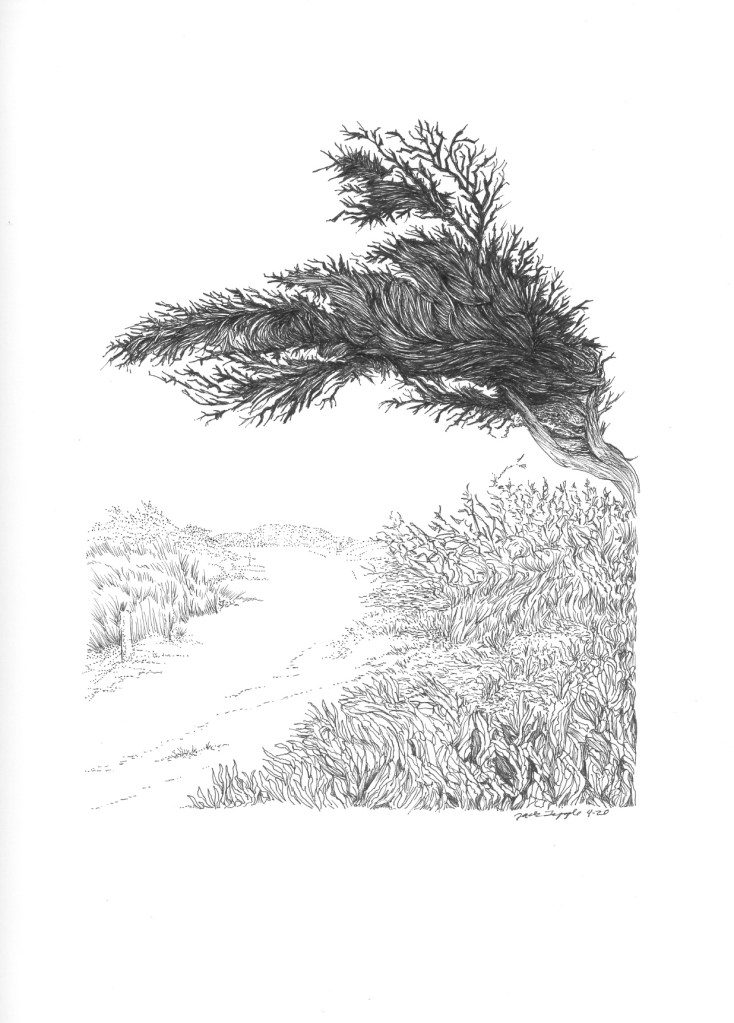 I love to run and hike in this magical land where I can spend hours upon hours. It’s a fruitful environment for my drawing. I take photos with my iPhone of places that speak to me and I download some to my desktop computer. From there I make a pencil sketch and from that, a drawing in pen and ink.