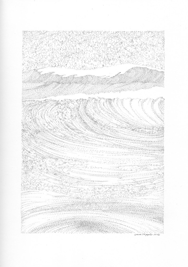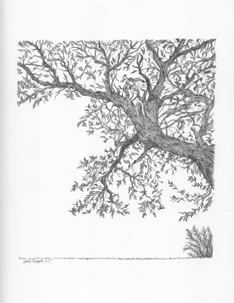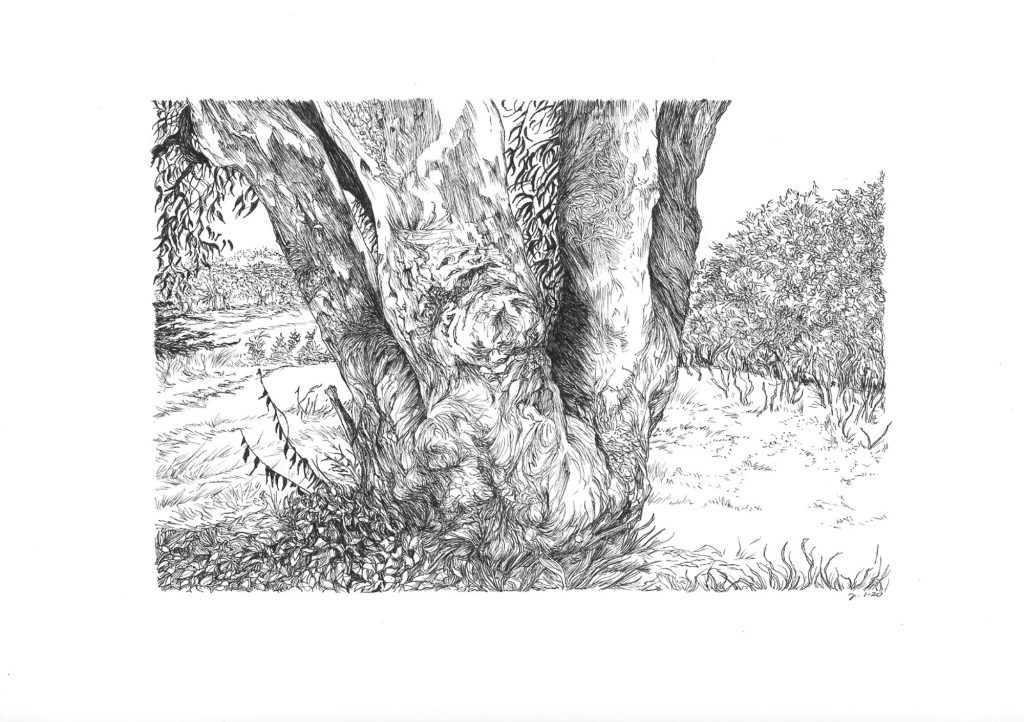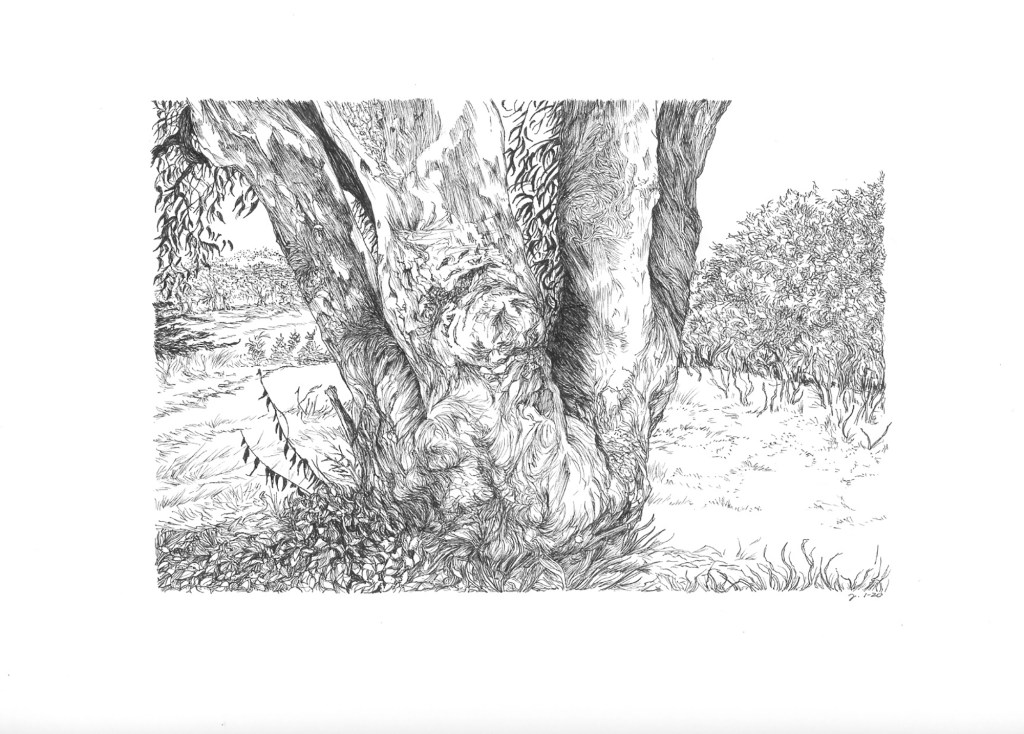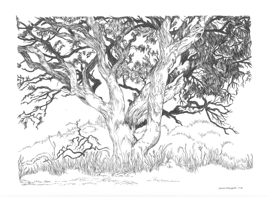 I love to run and hike in this magical land where I can spend hours upon hours. It’s a fruitful environment for my drawing. I take photos with my iPhone of places that speak to me and I download some to my desktop computer. From there I make a pencil sketch and from that, a drawing in pen and ink.
